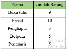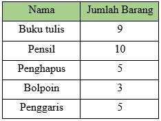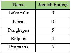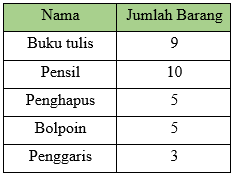 2. Perhatikan bacaan berikut dengan cermat! Dian adalah ketua kelas 4A. Ia akan membelikan sejumlah kebutuhan alat-alat tulis di koperasi sekolah untuk teman-teman sekelasnya. Berdasarkan kebutuhan tersebut tercatat ada 5 barang yang harus dibeli yaitu 9 buku tulis, 10 pensil, 5 penghapus, 3 bolpoin, dan 5 penggaris. Tabel yang tepat sesuai bacaan di atas adalah. . .