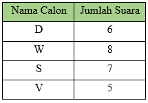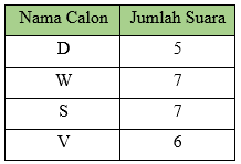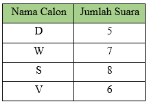 3. Kelas V hendak melakukan pemilihan ketua kelas. Ada 4 orang calon, yaitu Dodi (D), Wiwid (W), Septia (S), dan Vita (Vita). Setelah dilakukan pemungutan suara, diperoleh data sebagai berikut.